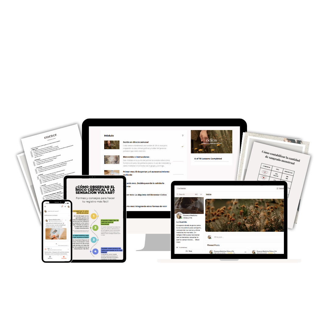 Una comunidad para no caminar sola, con acceso a recursos prácticos, gráficas y resolución de dudas. Incluye retos sencillos para ayudarte a conectar con tu cuerpo y tu ciclo. Un lugar para integrar lo aprendido y sostener tu proceso en el tiempo.